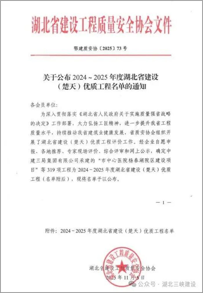 熱烈祝賀我公司在2024-2025年度湖北省建設(shè)(楚天)優(yōu)質(zhì)工程名單中,湖北三峽建設(shè)項(xiàng)目管理股份有限公司(含原宜昌平湖工程建設(shè)監(jiān)理有限責(zé)任公司)等5個(gè)項(xiàng)目榮獲我省“楚天杯”!