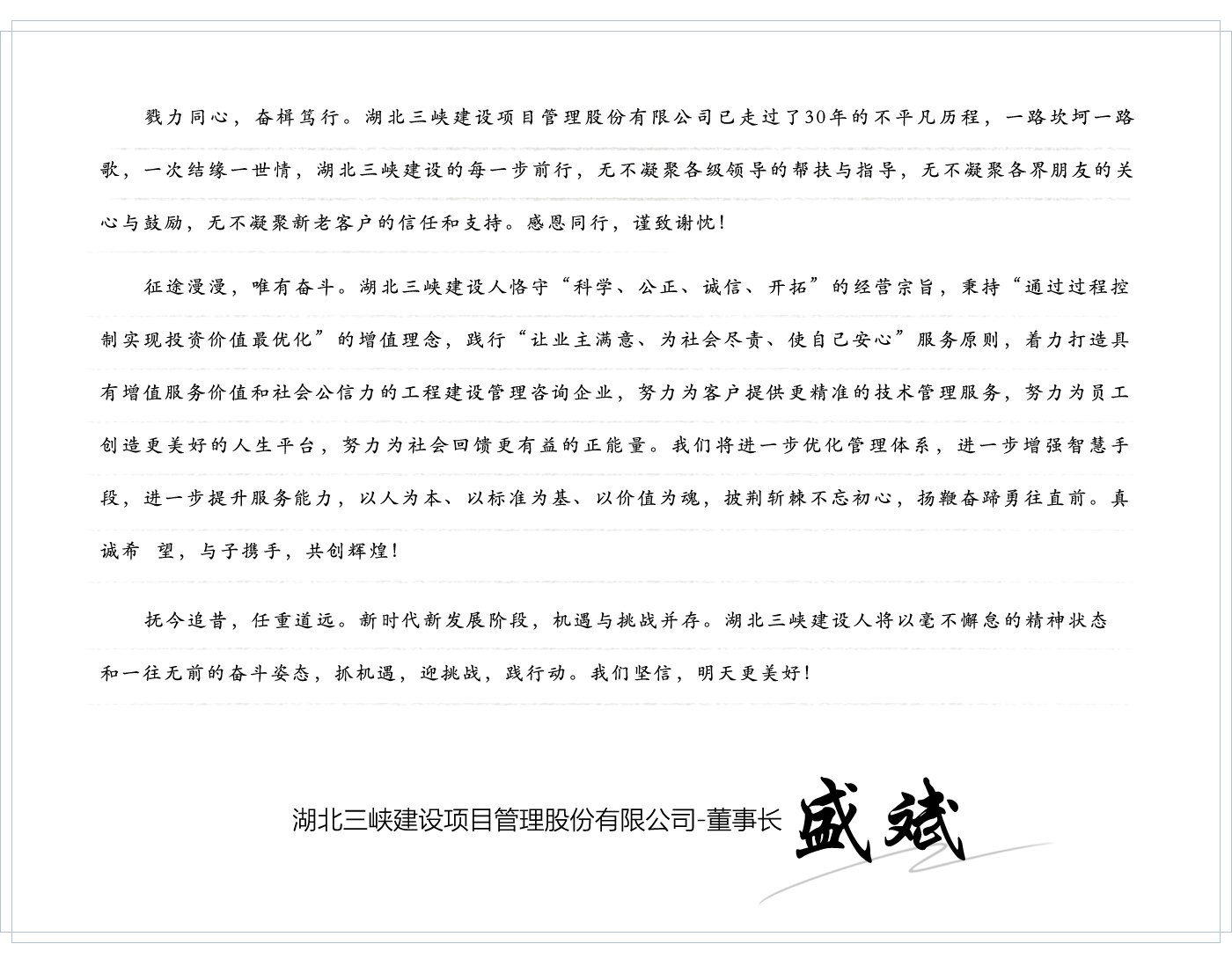 新時代新征程新夢想,湖北三峽建設(shè)項(xiàng)目管理股份有限公司將以優(yōu)勢整合為新起點(diǎn), 遵循科學(xué)理念、創(chuàng)新管理機(jī)制、提升服務(wù)效能,竭誠為客戶提供更優(yōu)質(zhì)的工程管理咨詢服務(wù),為建設(shè)成為客戶信賴、服務(wù)增值、效能卓越的一流工程管理咨詢企業(yè)而努力奮斗。
